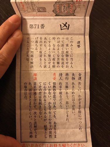 解释日本抽签被认为是一个非常重要的部分。当人们得到一张“Omikuji在那之后,它通常被折叠或卷曲。这个过程可以确保抽签的机会是随机的。同时,在解释时,需要考虑位置和天气等因素。
