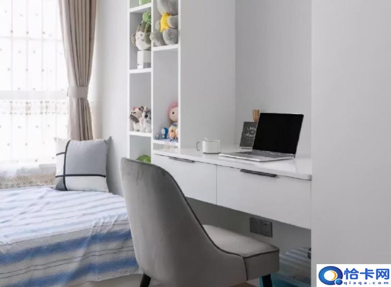 想要满足床边收纳纳功能,又想卧室变得与众不同,可以试试将床头柜扔掉,用书桌或者梳妆台代替床头柜也是一个不错的选择,直接将卧室升级为多功能书房。不过这对于床侧的空间有一定的需求,因为书桌的长度至少有80cm,才会让人感觉舒适,宽度在50cm,双腿才能有伸展的空间。