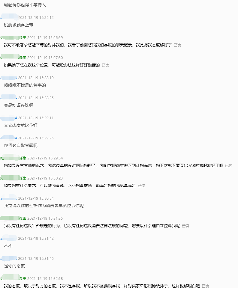 简单讲述一下事件经过吧,这位大神买了我们两件衣服,其中一个尺码不合适换货了一件(江苏寄到浙江,跟我们要了20块钱运费)。结果换过去的,因为是不同批次的,面料材质不一样,这大神说我们是以次充好。我们客服说可以给他重新换一件原来那个批次的去,不同意。提出让他退货退款,不同意。提出给他补偿10块钱,不同意。后来又挑出一个问题,说是印花印的不工整……连续3天换了3个不同客服接到,一直就是威胁刁难客服,客服提出任何方案都不接受,一定要找领导给他解决。