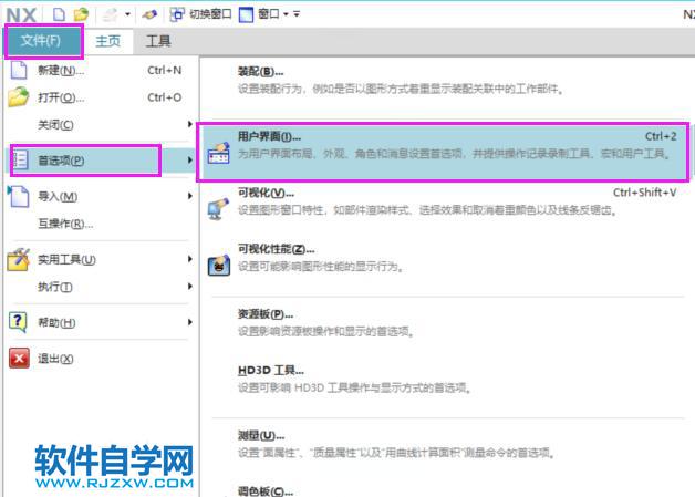 1、选择文件选项卡→首选项→用户界面。