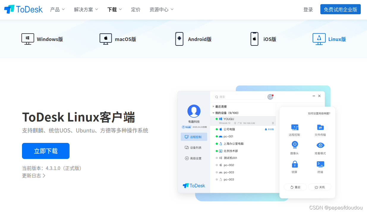 下面以我的小米12和安装有ubuntu18.04.6的普通PC机为例,介绍如何实现手机和PC机之间的互相操作。ToDesk支持多设备跨平台运行,所有的版本都可以在官网搞定。