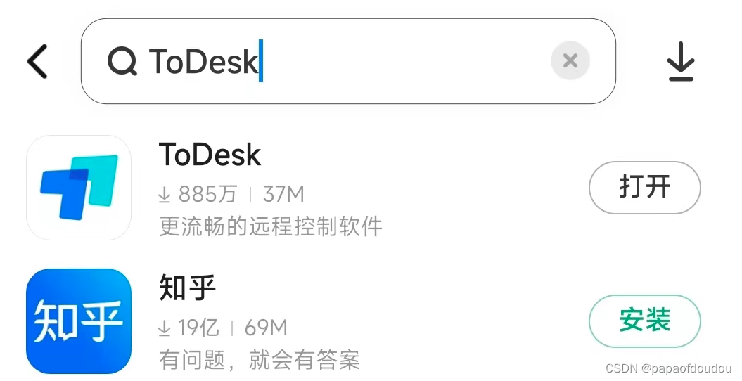 除此之外,手机端还可以在应用商店下载,在手机端应用商店搜索todesk,下载安装ToDesk应用: