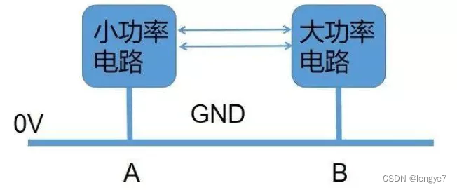 大功率电路,顾名思义,是电流比较大的电路。很显然大的电流,容易造成不同功能电路之间的地偏移现象,如下图所示。