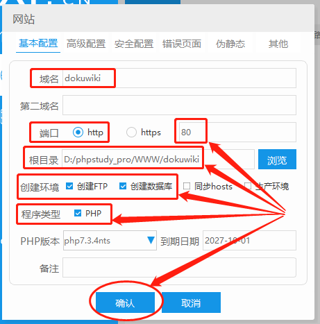 接着是FTP和数据库的设置,在“创建环境”行勾选“创建FTP”和“创建数据库”项,就会分别跳出这两个项目的设置页面。为防止混淆,本例中将FTP用户名设置为“dokuwiki”,密码则选择简单密码;而数据库名称dukuwiki是自动生成的,我们不必更改,用户名和密码也可以选择自己喜欢的输入(我们需要记住用户名和密码,用于其后网页安装时填入)。完成这几项后,就能点击页面下方的“确认”,建立网页运行环境。