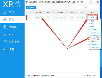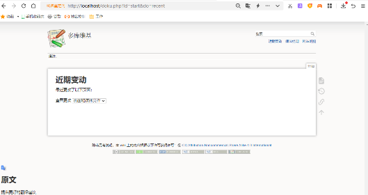 接着phpstudy就会显示dokuwiki的网页环境创建成功,我们可以点击对应网站环境条目右侧的“管理”按钮,找到并点击“打开网站”,就能看到dokuwiki已经成功安装到我们的电脑上。同样,我们也可以在浏览器地址栏中输入“localhost:80”通过本地打开dokuwiki网页。