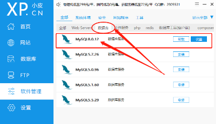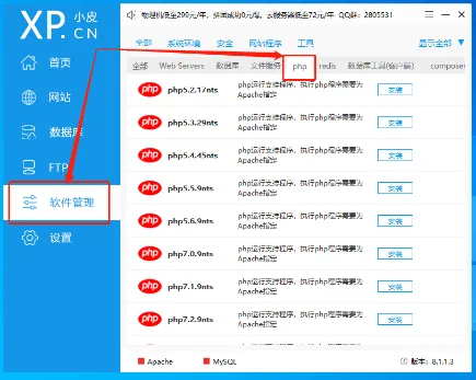 完成这两个软件的安装后,我们先打开phpstudy,设置DokuWiki的运行环境。Dokuwiki的运行主要依赖Apache、MyAQL、FileZilla,因此我们需要在phpstudy中安装这几个插件。首先打开phpstudy主界面,在主界面左侧找到“软件管理”项,接着在右侧上方位置找到“php”选项,点击就能筛选处各个版本的php软件。选定所需的php版本后,点击所选版本右侧的“安装”即可。同理,我们在“数据库”中找到MySQL,在“FileZilla”中找到fileAZilla,在“Web Servers”中找到apache。当然,我们也能在“全部”这个页面中找到所需的各个软件,只是比较费眼睛。