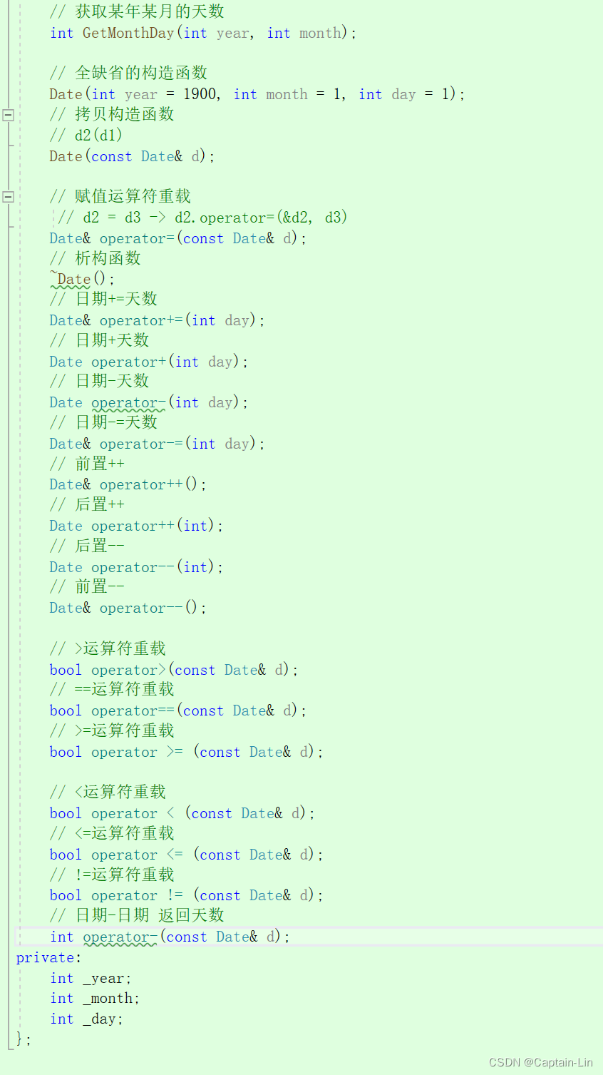 private:int _year; // 年int _month; // 月int _day; // 日