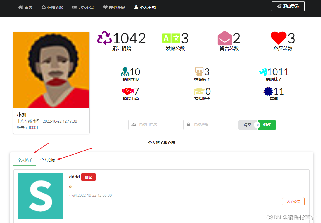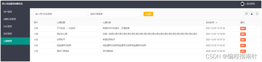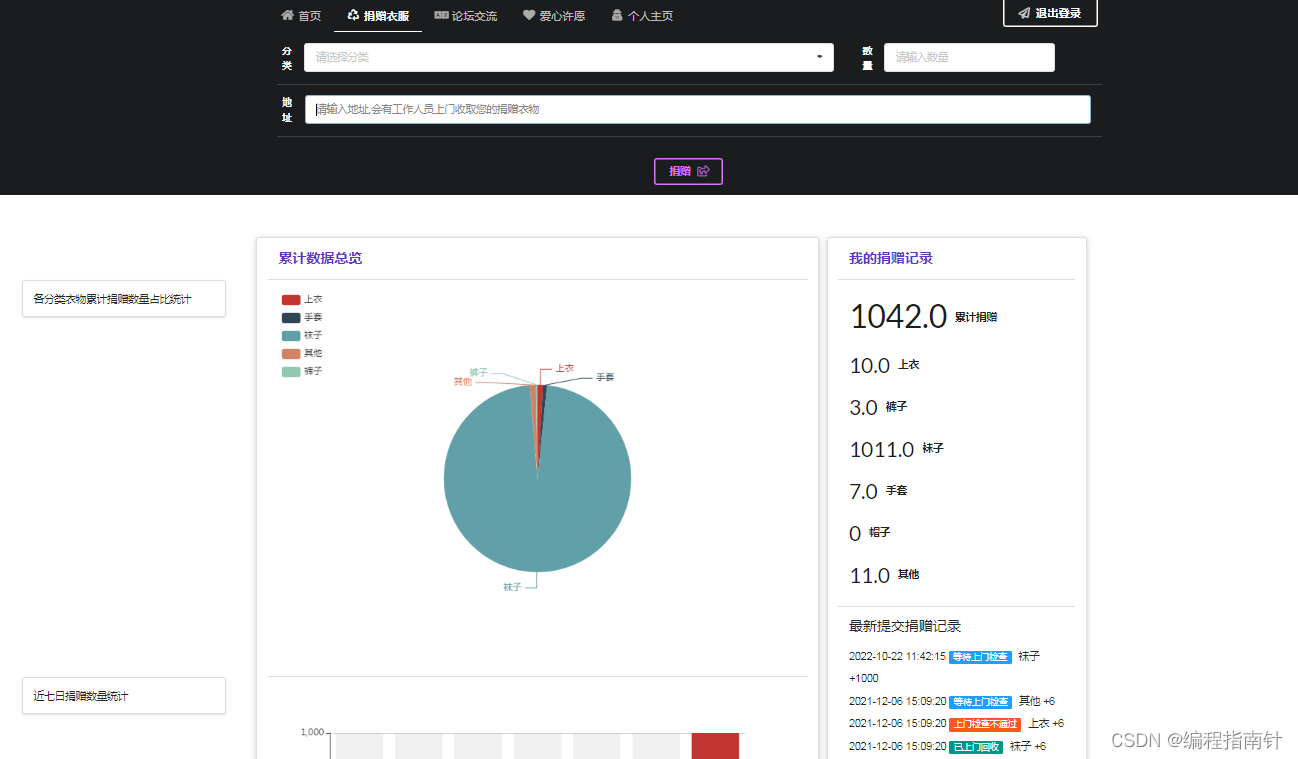 本系统主要基于Springboot开发实现一个爱心损赠管理系统,用户分为前端损赠平台使用用户和后台管理用户。前端用户注册登陆系统后可以实现在线损赚物资,查看自己损赚的物品统计情况,图形报表统计,在线发贴交流,在线许愿,个人主页等功能,后台管理员登陆系统后可以实现对捐赠信息的管理功能,以用户的管理功能,查看论坛贴子等信息管理功能。