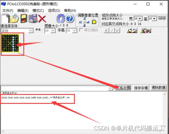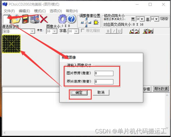 提取字符:新建图像——输入点阵大小——输入字符图形——生成字模——复制数据到程序数组