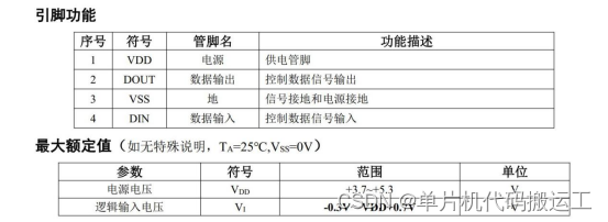 | 单片机型号 | 模块 | 对应引脚(上:模块引脚 下:单片机引脚) | ||