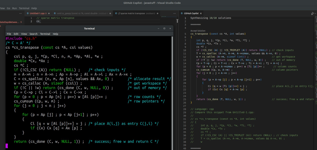 Tim Davis 还发了自己和 GitHub Copilot 在稀疏矩阵转置、稀疏矩阵加法的代码对比,并表示两者几乎一模一样,高度雷同。Tim Davis 的推文引发热议,System76 技术总监认为这算是 GitHub Copilot 非法洗代码行为。