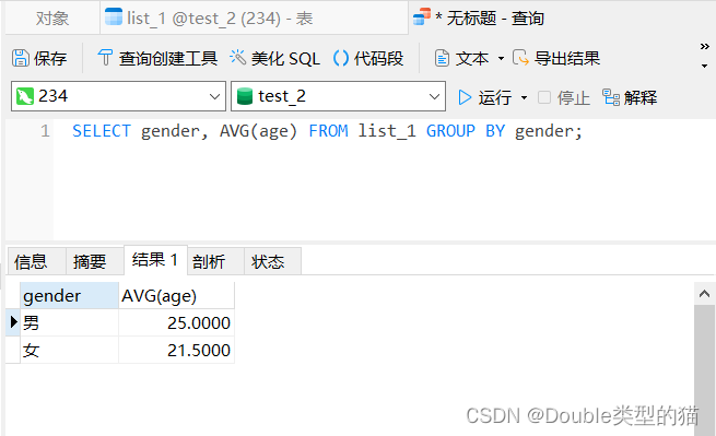 然后统计一下男性女性的平均年龄,加上AVG(*)即可,由于我们要求的年龄的平均值,所以把age作为参数代入。
