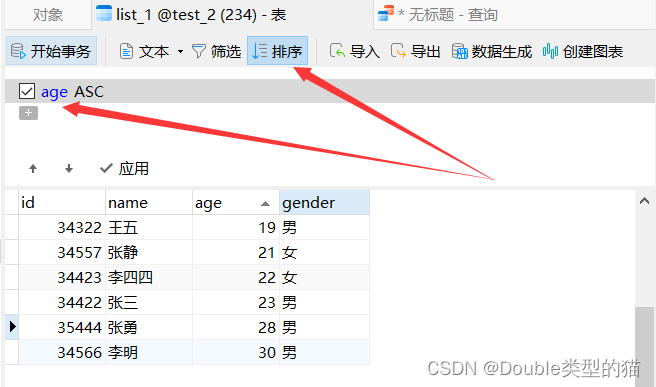 点击排序后会出现一个勾选框,点击链接可以选择按什么排序,点击“应用”即可。如果手动输入的话查询语句为:SELECT * FROM list_1 ORDER BY age ASC; 结果自然相同。如果i按照降序排序,排序方式改为 DESC 即可。