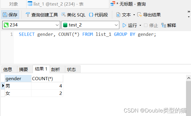 案例:根据性别分组,分别查询男女数量;根据性别分组,分别查询平均年龄。