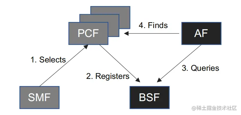 当在网络中部署语音业务时,通常需要一个附加的网络功能。这对应于网络中使用多个PCF的场景。通常在查询NRF之后, SMF选择将要服务于特定数据会话的PCF。这意味着不同的数据会话可能由不同的PCF(以及不同的SMF) 提供服务。对于外部应用来说, 要定位正在为特定数据会话提供服务的特定PCF, 它需要查询一个单独的网络功能,该功能维护PCF和会话的关系的记录, 称为绑定支持功能(BSF) , 它连接到5G核心网的SBA架构。BSF向PCF提供注册和注销有关数据会话信息的业务, 并向其他应用提供查询服务, 即哪个PCF服务于一个特定的数据会话。对于语音业务, 应用功能(AF) 是IMS P-CSCF。这些概念不是非常复杂,但是对于连接IMS和5GC域而言, 当部署多个网络功能时, 是非常重要的。BSF是通过称为Nbsf的基于服务的接口定义的。