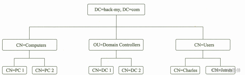 CN=DC1, OU=Domain Controllers, DC=hack-my, DC=com其含义是DC1对象在hack-my.com域的Domain Controllers组织单元中,类似文件系统目录中的绝对路径。其中,CN=DC 1代表这个主机的一个对象,0U=Domain Controllers代表一个Domain Controllers组织单位。