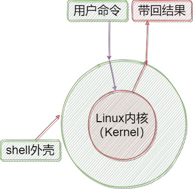 Linux严格意义上说的是一个操作系统,我们称之为"核心(Kernel)"。但是用户和内核沟通的学习成本很高,所以在内核外部有一层Shell外壳程序,将用户输入的指令翻译传递给内核,内核处理后,将结果返回给Shell,由Shell向用户传达指令的最终结果。