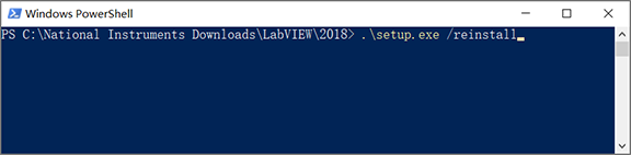 如果输入了有效目录,则应该在命令提示符下看到目录更改。具体来说,在此示例中,用户希望强制重新安装其安装文件位于C:\National Instruments Downloads\LabVIEW\2018中的安装程序。