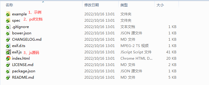 注意:EXIF标准仅适用于“.jpg”和“.tiff”图像。Exif.js的开源地址为:Exif-js地址,喜欢中文的可以参考汉化版:汉化版Exif.js,有兴趣的朋友可以自行下载学习。以下是我本机的工程实例目录(英文版):
