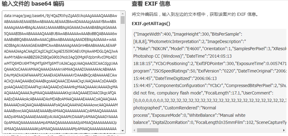Exif.js 提供了 JavaScript 读取图像的原始数据的功能扩展。在现在的应用中,会存在将图片信息进行字符流化的,因此需要对字符流化的数据也进行加载。示例代码如下: