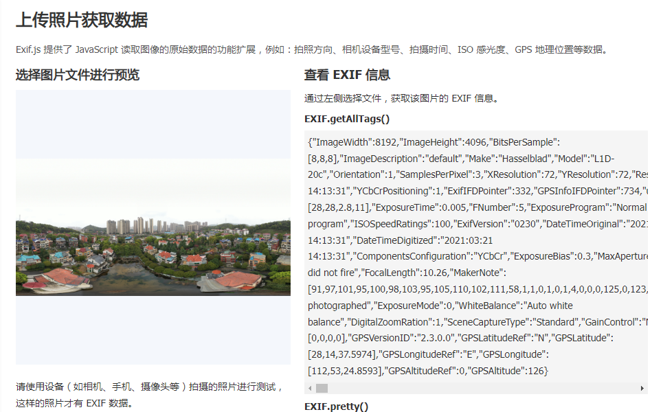 Exif.js同时也支持使用文件上传的方式对图片的信息进行加载。其原理和第一种的方式几乎是一样的。所以这里展示一下示例页面吧。