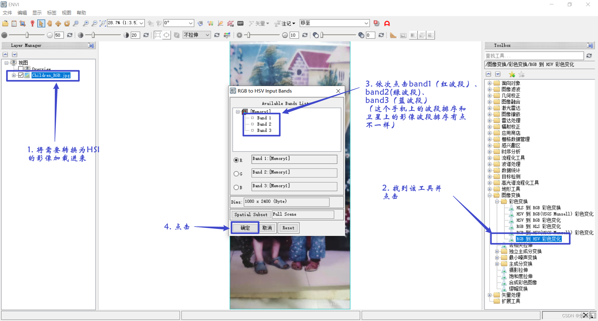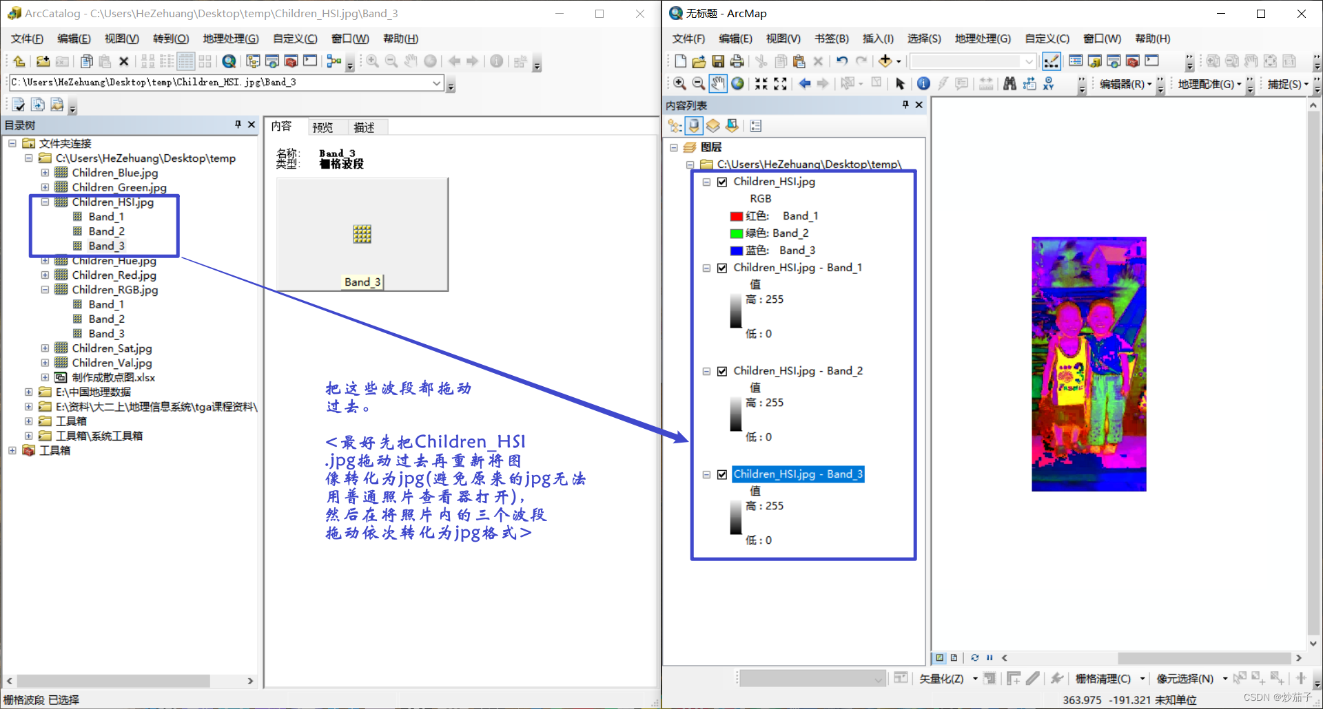 另外,由于方法十分多,以下方法是认为比较简单(未必方便)的方法,一是转化为HSI比较简单(用ENVI即可实现),二是多波段转化为几个单波段影像很简单而且手机就能查看而不是专业的ArcMap才能打开。这里全部使用jpg格式是由于其它格式的照片用普通照片查看器无法打开等等。