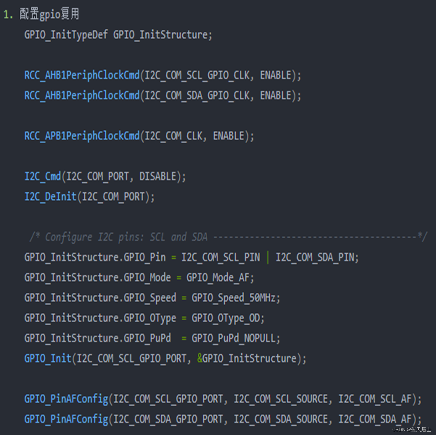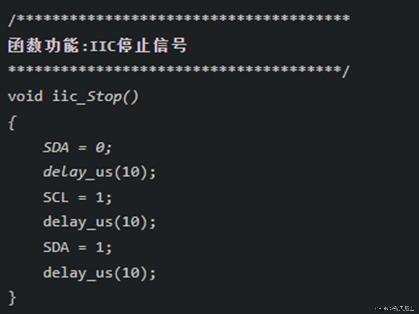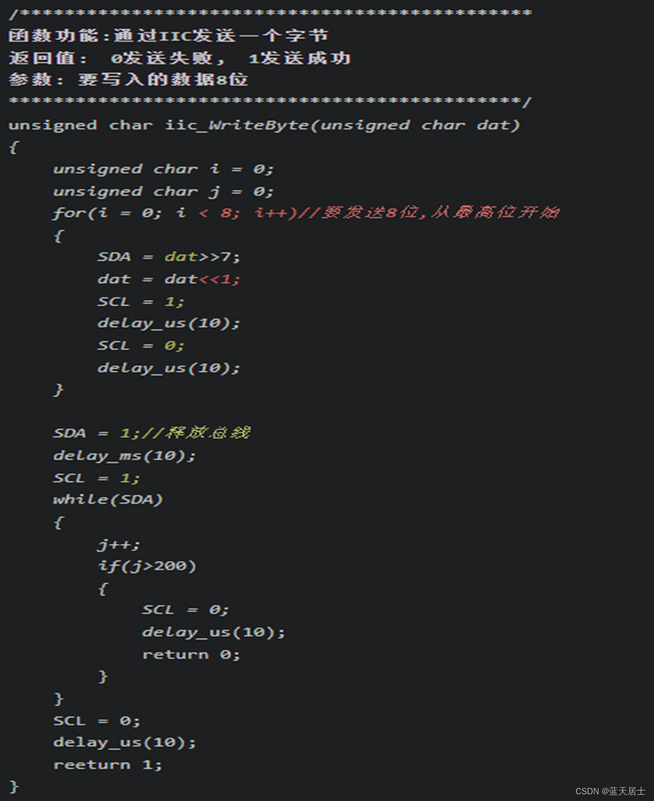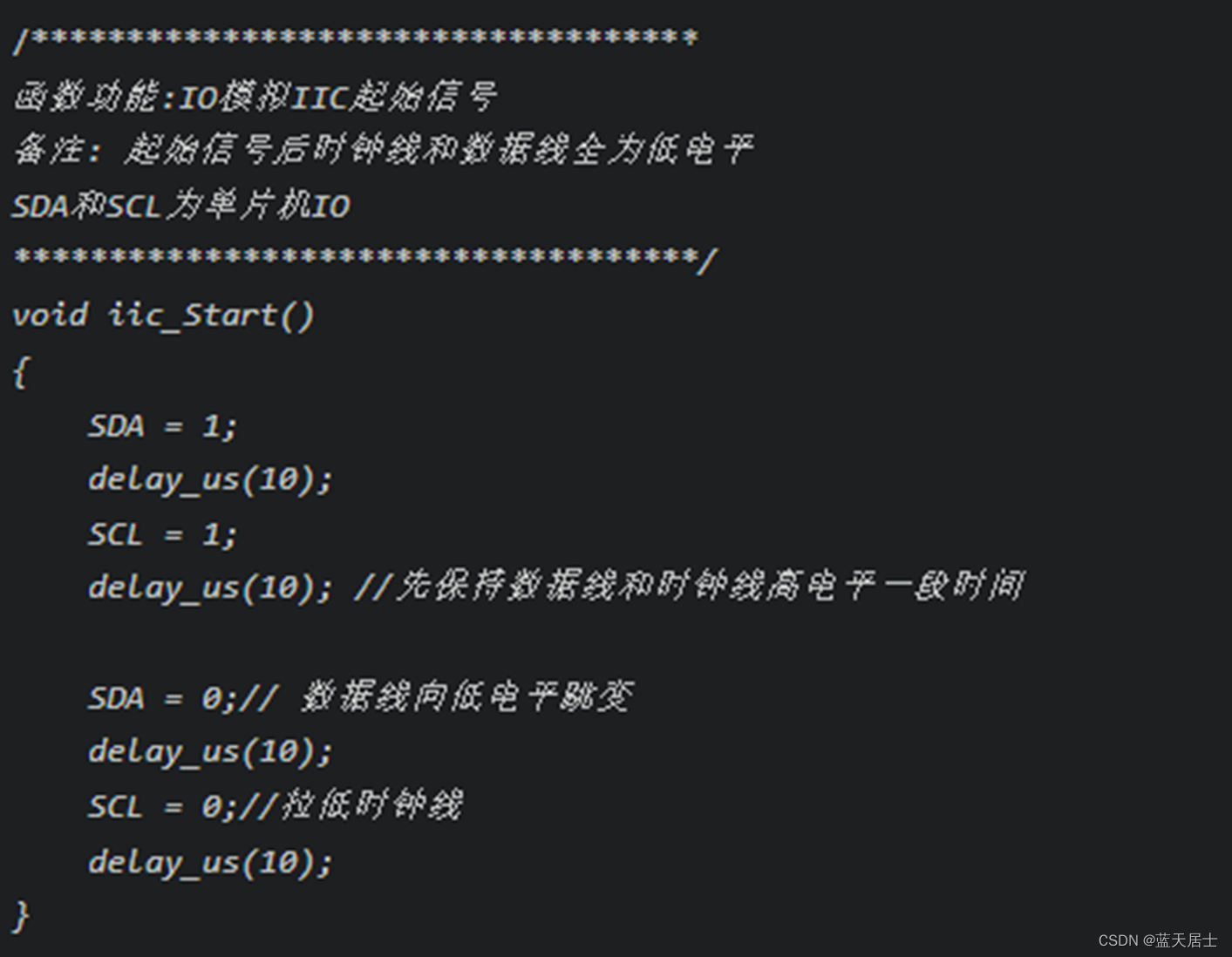 时钟线(SCL)高电平,数据线(SDA)从高电平跳变到低电平。代码如下: