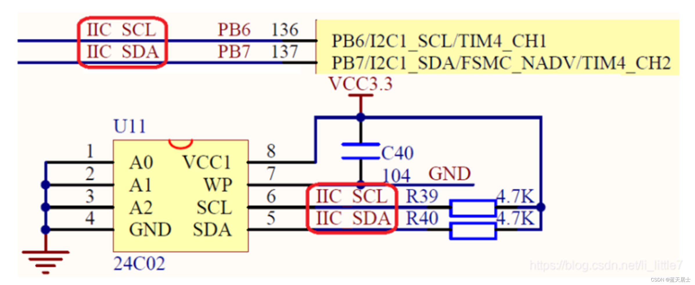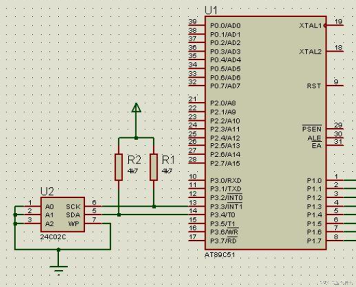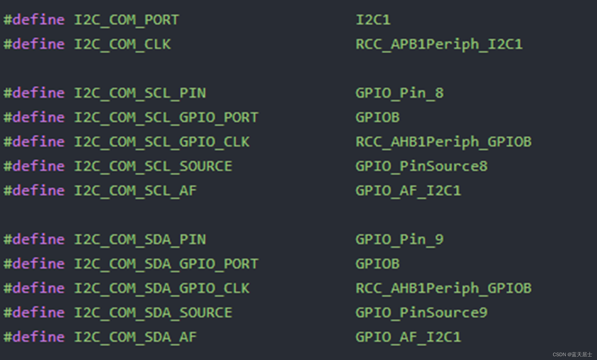 软件I2C一般是选择单片机中的任意两个空闲GPIO口(管脚复用都选择最基本的GPIO),其中一个口线作为时钟线(SCL),另一个口线作为数据线(SDA),与I2C设备的SCL和SDA一一对应连接,用软件控制GPIO口即SCL、SDA输出高低电平,模拟I2C总线的时序,从而与I2C设备进行通信。