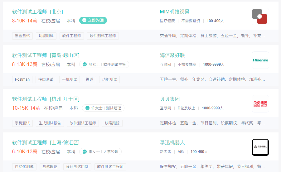 而且,这些年来软件测试的岗位需求越来越大,不只是北上广深杭,更多的新一线、二线城市已经大量招聘软件测试工程师,并开出10k以上的月薪。在9-10月开启的软件测试招聘中,就可以看到上千家公司应聘软件测试应届生!