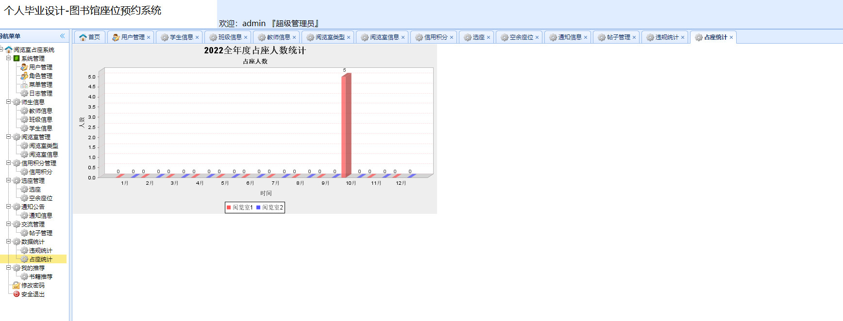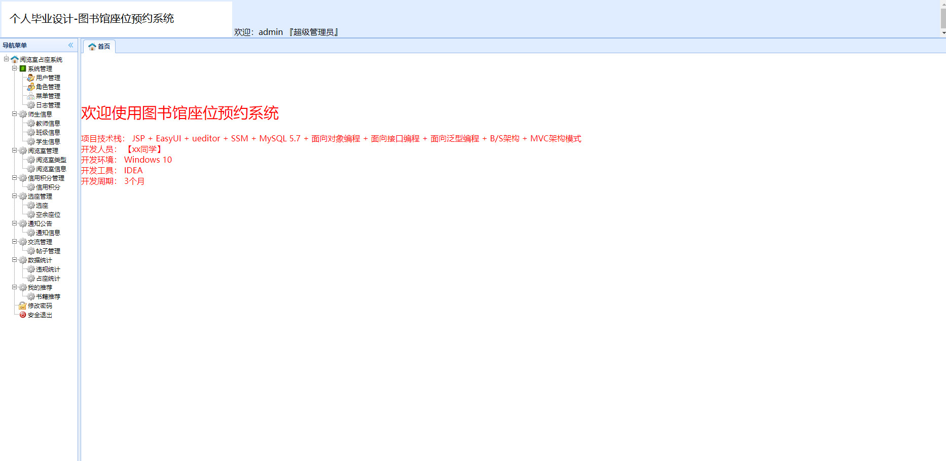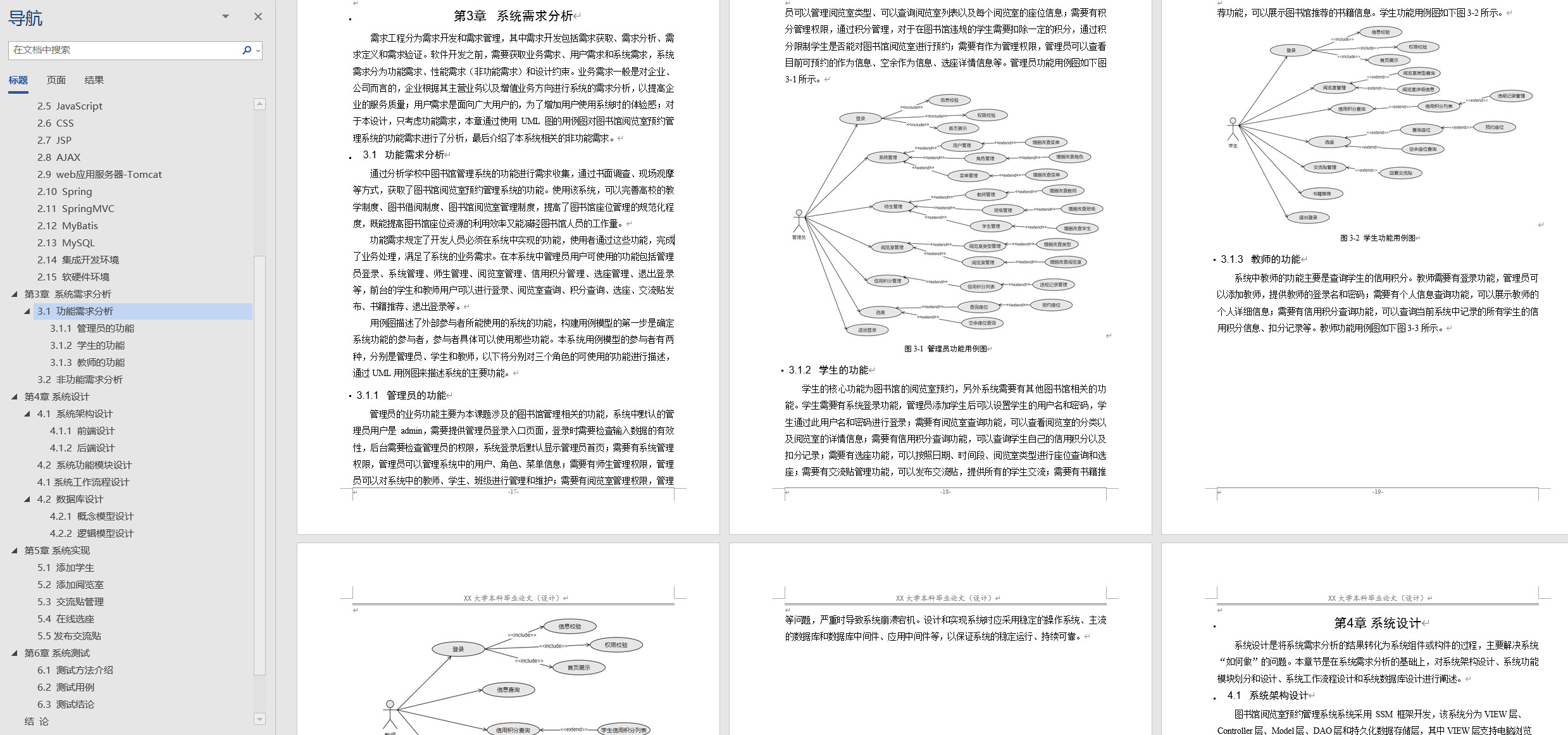 管理员用户可使用的功能包括管理员登录、系统管理、师生管理、阅览室管理、信用积分管理、选座管理、退出登录等,前台的学生和教师用户可以进行登录、阅览室查询、积分查询、选座、交流贴发布、书籍推荐、退出登录等。