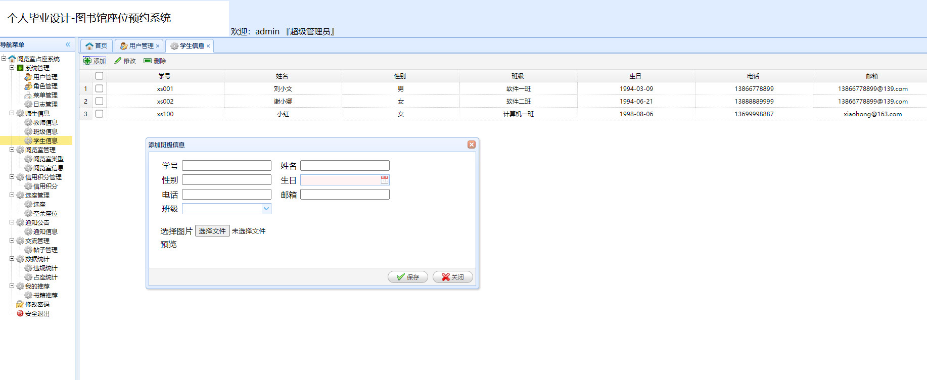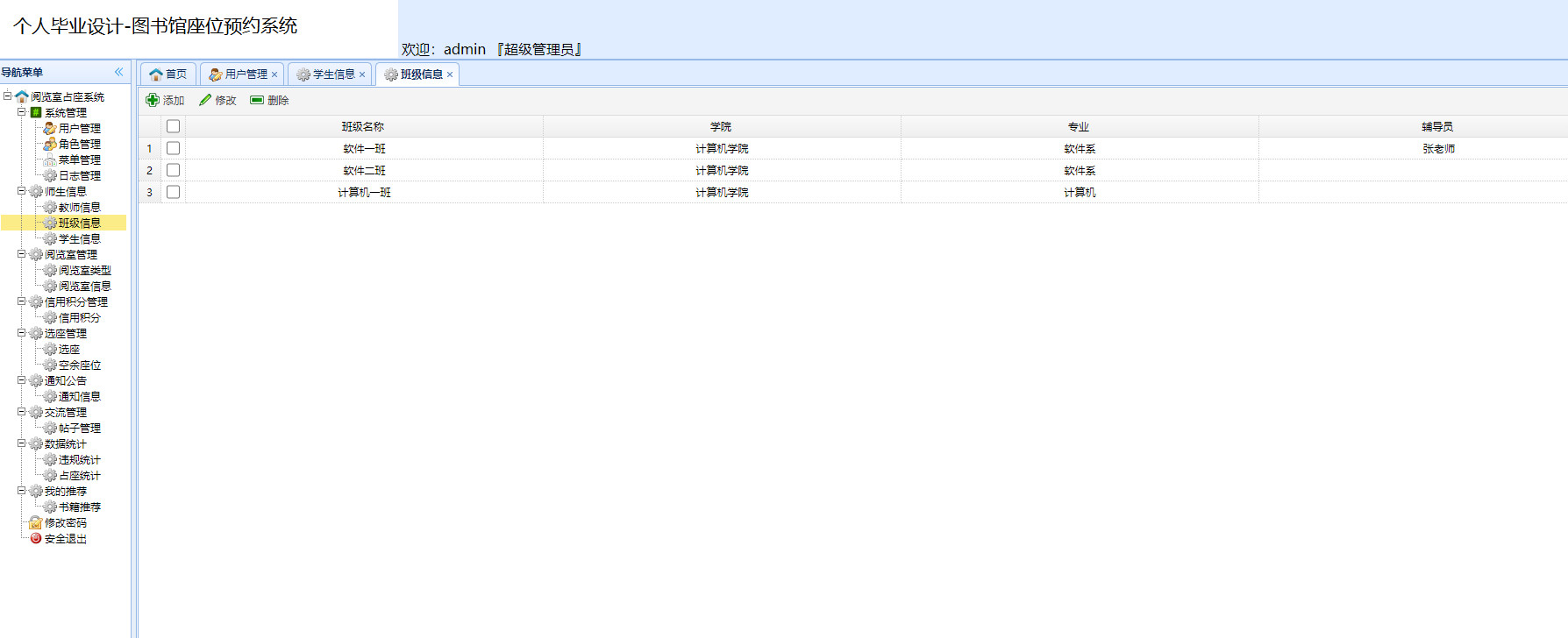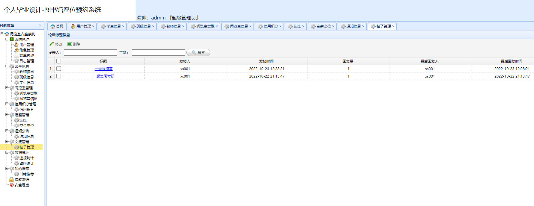 管理员用户可使用的功能包括管理员登录、系统管理、师生管理、阅览室管理、信用积分管理、选座管理、退出登录等,前台的学生和教师用户可以进行登录、阅览室查询、积分查询、选座、交流贴发布、书籍推荐、退出登录等。