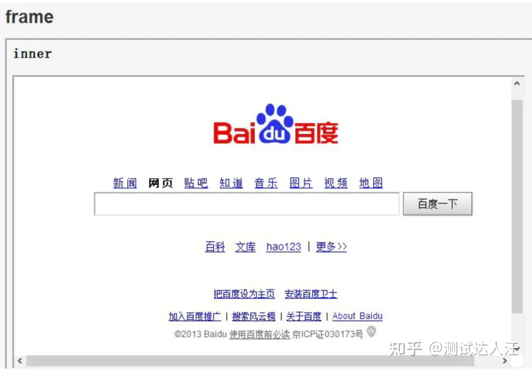 首先我们进入页面的时候,就已经在frame 页面中了,如果我们想要在inner页面的百度搜索框输入内容,就要定位到inner页面(inner的frame 标签),然后再进入到inner页面中,然后定位inner页面中的百度搜索框,输入内容。