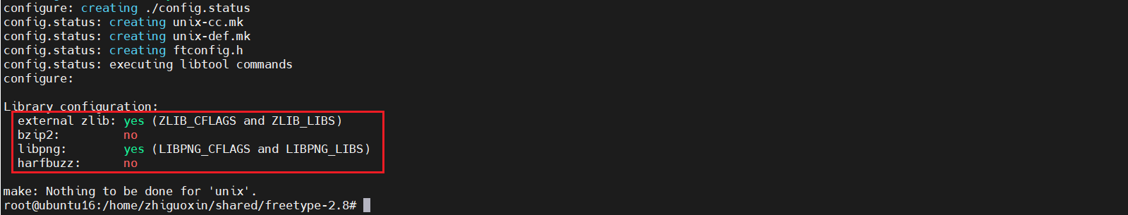第一个配置宏表示使用系统安装的zlib库,因为 FreeType支持Gzip压缩文件,会使用到zlib库,zlib之前我们移植好了;第二个配置宏表示支持PNG bitmap位图,因为FreeType可以加载PNG格式的彩色位图字形,需要依赖于libpng 库,这个库前面我们也是移植好了。