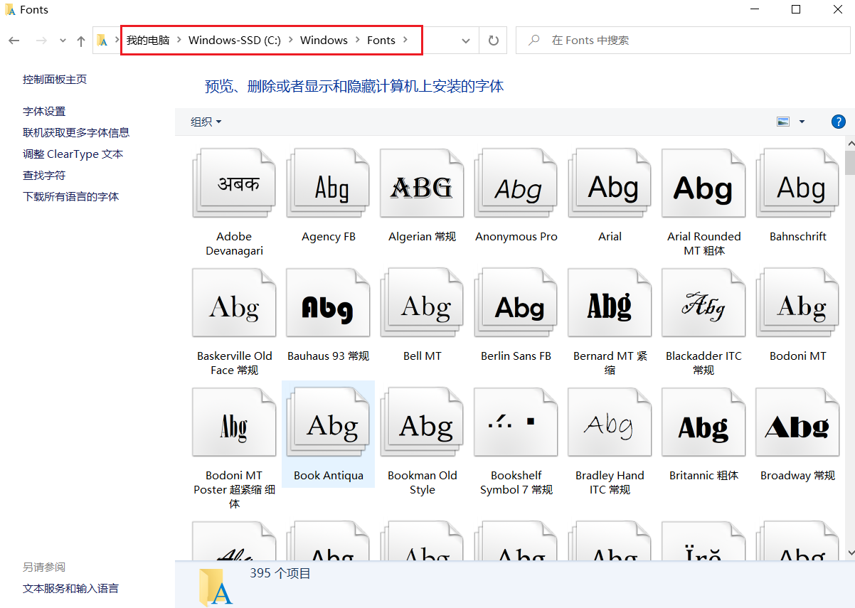 操作系统中通常都会有很多的字体文件,譬如 Windows 系统C:\Windows\Fonts目录下就有很多的字体文件,如下所示: