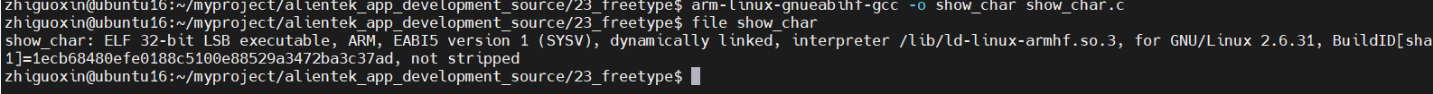 这样编译出来的 led程序才可以在ARM板子上运行。执行file show_char命令就可以看出hello是32位LSB的ELF格式文件,目标机架构为ARM,说明这个交叉编译正常,可执行文件可以在ARM板上执行。