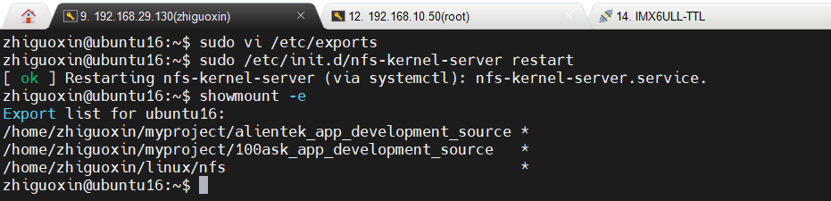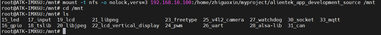 mount -t nfs -o nolock,vers=3 192.168.10.100:/home/zhiguoxin/myproject/alientek_app_development_source /mnt