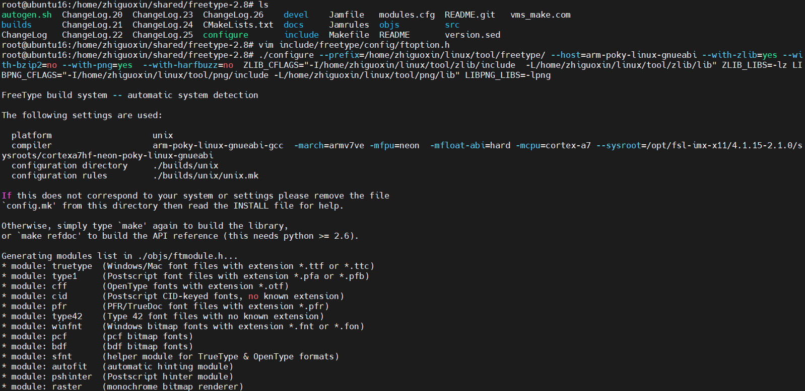 ./configure --prefix=/home/zhiguoxin/linux/tool/freetype/ --host=arm-poky-linux-gnueabi --with-zlib=yes --with-bzip2=no --with-png=yes --with-harfbuzz=no ZLIB_CFLAGS="-I/home/zhiguoxin/linux/tool/zlib/include -L/home/zhiguoxin/linux/tool/zlib/lib" ZLIB_LIBS=-lz LIBPNG_CFLAGS="-I/home/zhiguoxin/linux/tool/png/include -L/home/zhiguoxin/linux/tool/png/lib" LIBPNG_LIBS=-lpng