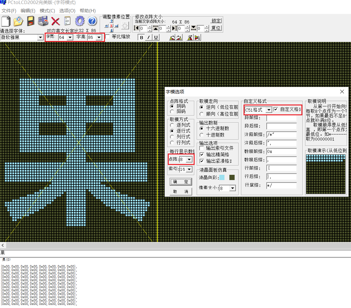 我们可以通过一些字符取模软件获取到字符的子模;所谓子模,其实就是一个二维数组,用于表示字符点阵中,哪些小方块应该要填充颜色、哪些小方块不填充颜色。譬如上图果字符点阵,这是一个宽度为64(64 个小方块)、高度为 86(86 个小方块)的字符点阵,我们会使用一个二维数组来表示这个字符点阵: