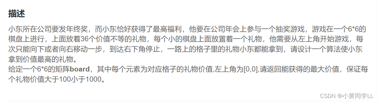 定义f(i,j)表示从左上角走到坐标(i,j)处能获得的最大奖励。 搜索所有从左上角走到右下角的路径,找到最优路径。 f(i,j)分三种情况: 第一列:f(i, 0) = f(i-1, 0) + board(i, 0) 如果处在第一列,那么由于是第一列,所以从起点走,它只可能是向下不断走的到的 第一行:f(0,j) = f(0, j - 1) + b(0, j) 如果处在第一行,那么由于是第一行,所以从起点走,它只可能是向右不断走得到的 其它位置:f(i, j) = max{f(i-1, j), f(i, j - 1)} + board(i, j) 最后返回右下角的值