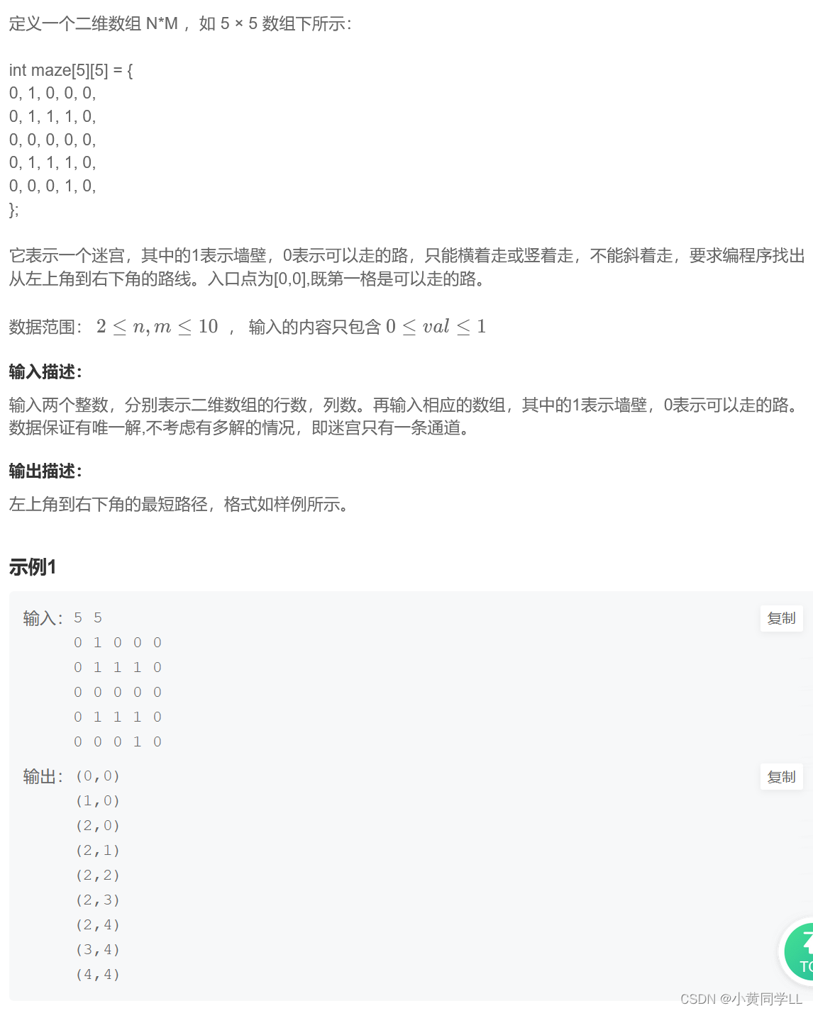 int main() {cin >> ROW >> COL;maze = vector>(ROW, vector(COL, 0)); //开辟迷宫空间//首先输入迷宫for (int i = 0; i < ROW; ++i) {for (int j = 0; j < COL; ++j)cin >> maze[i][j];}MazeTrack(0, 0); //从起始点(0,0)开始走