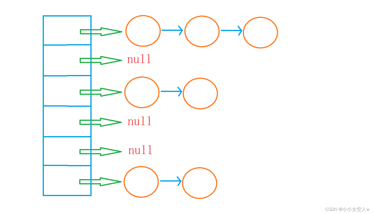 public class MyHashList {static class Node {public int key;public int val;public Node next;public Node(int key, int val) {this.val = val;this.key = key;}}private static final int DEFAULTSIZE = 10;private Node[] arr;private int size;public MyHashList() {arr = new Node[DEFAULTSIZE];this.size = 0;}//扩容后,数组长度会改变,原来的值需重新Hashprivate void addCapicity() {Node[] tmp = new Node[arr.length * 2];for(int i = 0; i < this.arr.length; i++) {Node cur = arr[i];//直接将cur拿起,插入到新位置while(cur != null) {Node curNext = cur.next;int index = cur.key % tmp.length;//头插法cur.next = tmp[index];tmp[index] = cur;cur = curNext;}}this.arr = tmp;}public int put(int key, int val) {//遍历哈希表如果有相同key则替换其valfor(int i = 0; i < this.arr.length; i++) {Node cur = arr[i];while(cur != null) {if(cur.key == key) {cur.val = val;return val;}cur = cur.next;}}//采用头插法//哈希值通过哈希函数计算其下表int index = key % arr.length;Node newNode = new Node(key, val);newNode.next = this.arr[index];this.arr[index] = newNode;this.size++;//负载因子大于0.75,冲突率会大,需扩容float ret = size * 1.0f / arr.length;if(ret >= 0.75) {addCapicity();}return val;}public int get(int key) {//对象,会有自己对应的哈希码//根据哈希码可计算出对应的哈希值int index = key % arr.length;Node cur = arr[index];while(cur != null) {if(cur.key == key) {return cur.val;}cur = cur.next;}return -1;}public int size() {return this.size;}