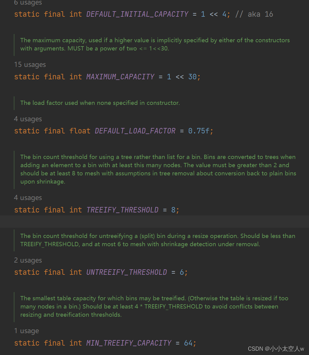 依次是:哈希表的默认容量,最大容量,负载调节因子,链表长度(链表树化条件),解树化条件,数组大小(链表树化条件)。