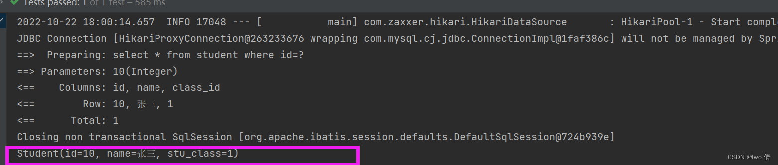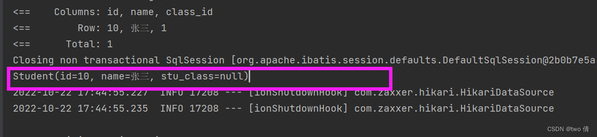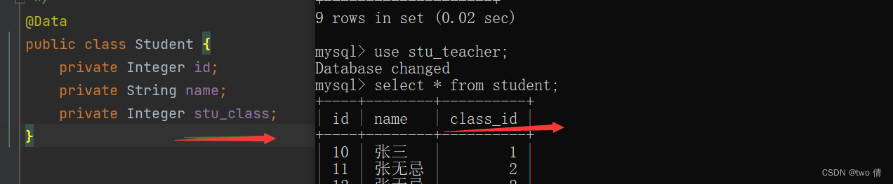 public class Student {private Integer id;private String name;private Integer class_id;private Class stu_class;