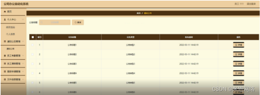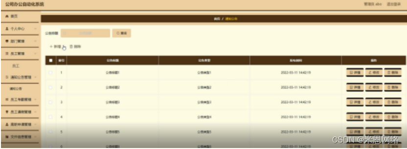 通知公告管理,在通知公告管理页面通过查看公告标题、公告类型、发布时间等信息进行详情等操作,如图5-12所示。