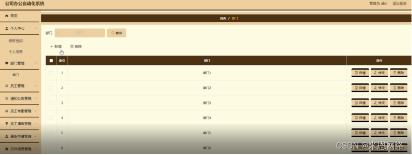 部门管理,在部门管理页面可以新增部门等内容,以及对部门管理进行查看、修改或删除等操作,如图5-6所示。