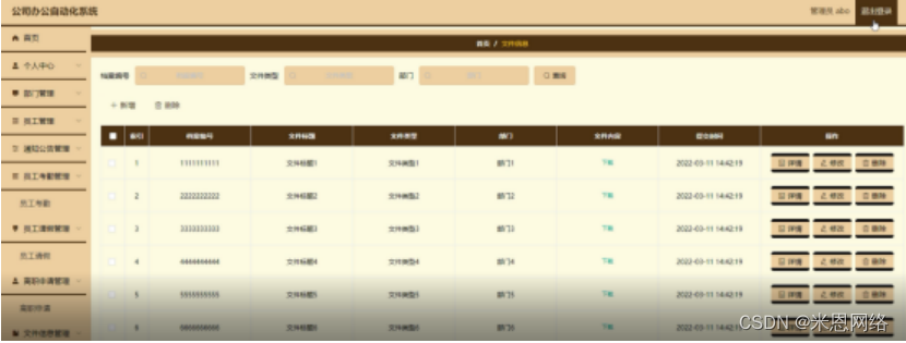 文件信息管理,在文件信息管理页面可以对档案编号、文件标题、文件类型、部门、文件内容、提交时间等内容进行查看、修改或删除等操作,如图5-9所示。