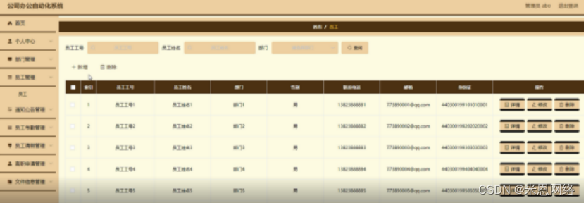 员工管理,在员工管理页面可以对员工工号、员工姓名、部门、性别、联系电话、邮箱、身份证等信息进行查看、修改或删除等操作,如图5-3所示。