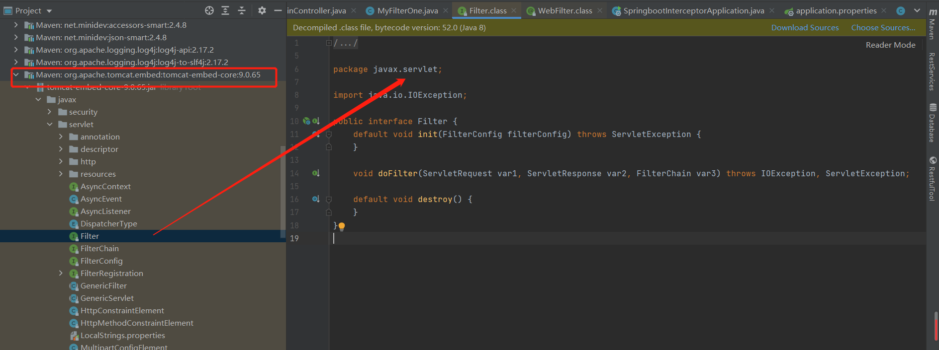 可见Filter过滤器是javax.servlet包下的,是在Servlet规范中定义的,也就是说过滤器Filter的使用依赖于Tomcat等容器,导致它只能在web程序中使用。