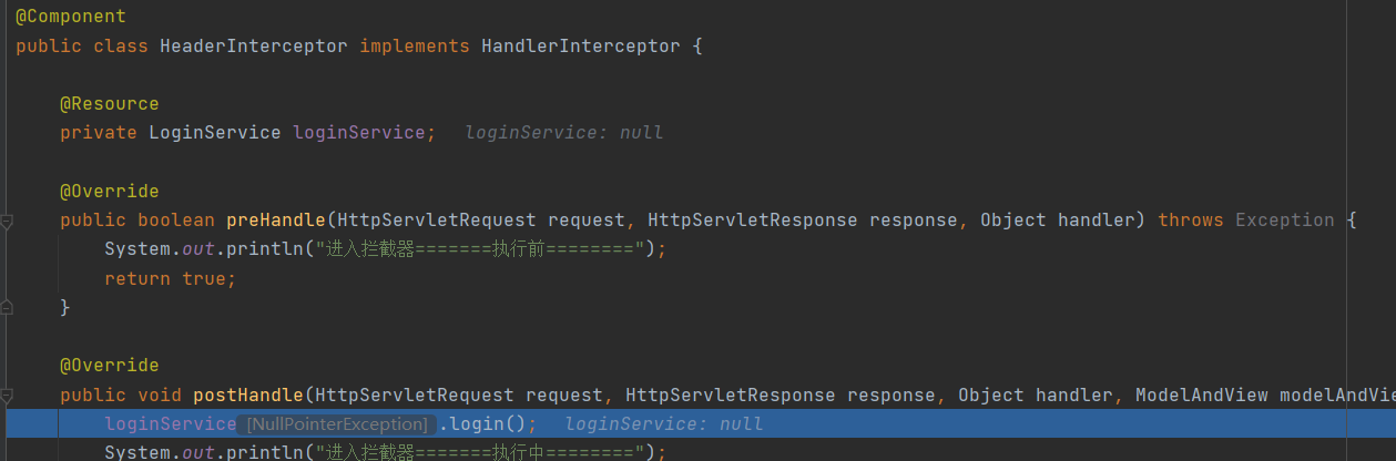 public class HeaderInterceptor implements HandlerInterceptor {@Resourceprivate LoginService loginService;@Overridepublic boolean preHandle(HttpServletRequest request, HttpServletResponse response, Object handler) throws Exception {System.out.println("进入拦截器=======执行前========");return true;}@Overridepublic void postHandle(HttpServletRequest request, HttpServletResponse response, Object handler, ModelAndView modelAndView) throws Exception {loginService.login();System.out.println("进入拦截器=======执行中========");}@Overridepublic void afterCompletion(HttpServletRequest request, HttpServletResponse response, Object handler, Exception ex) throws Exception {System.out.println("进入拦截器=======执行后========");}