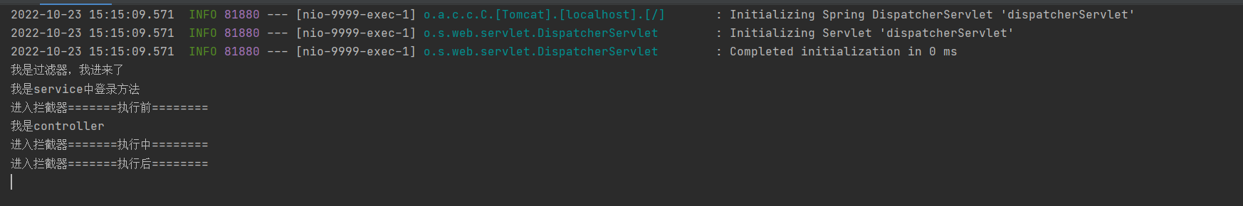 public class LoginController {@GetMapping("/test/filterAndInterceptor")public String testFilter(){System.out.println("我是controller");return "请看控制台谁先输出";}